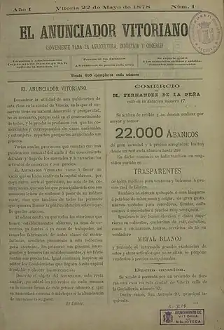 Fundado por Domingo Sar, en cuya imprenta de Vitoria se imprimía,[3] el primer número de El Anunciador Vitoriano vio la luz el 22 de mayo de 1878.[1][4][3] En el primer número, que lleva la coletilla de «conveniente para la agricultura, industria y comercio», el periódico se presenta en sociedad con un texto escrito por el editor y dirigido a los lectores que dice así:[4]