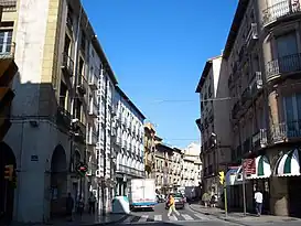 Esta céntrica calle oscense sirve de separación entre los barrios del Casco Antiguo (parroquias de la Catedral y de San Pedro el Viejo) y María Auxiliadora (al norte) y San José (al sur).