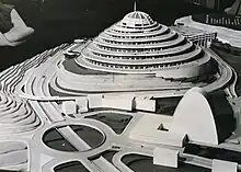 El Helicoide inicialmente planeado como un centro comercial avanzado durante el gobierno de Marcos Pérez Jiménez. Tras el derrocamiento de Pérez Jiménez en 1958, el proyecto quedó inconcluso.[2] Su construcción se emprendió por una compañía privada, la primera etapa de la obra concluyó en 1961. Fue diseñada por los arquitectos Pedro Neuberger, Dirk Bornhorst y Jorge Romero Gutiérrez. La obra estaría conformada por un centro comercial y exposición de industrias, un hotel cinco estrellas, un parque, un club de propietarios y en séptimo nivel un palacio de espectáculos. La particularidad de la obra era que los automóviles una vez ingresaran a la edificación por medio de rampas en ella se encontrarían locales comerciales con estacionamiento, estas rampas recorrerían 4 km en seis niveles bordeando la colina sobre la cual fue construida.[3]