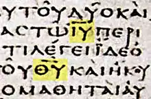 En los manuscritos del Nuevo Testamento ciertos nombres y títulos aparecen no como palabras enteras sino en forma abreviada debajo de una línea horizontal. Los cuatro primeros son Κύριος = Señor (que aparece como κς); Ἱησοῦς = Jesús (ιη, (ιης; Χριστός = Cristo (χρ, (χς, (χρς); Θεός = Dios (θς). Un quinto nombre o título, que puede ser de no menos temprana fecha es Πνεῦμα = Spirito (πνα). Se trataba de la misma manera σταυρός, y más tarde Πατήρ (Padre), Υἱός (Hijo) y algunos otros.[80][81][82][83]