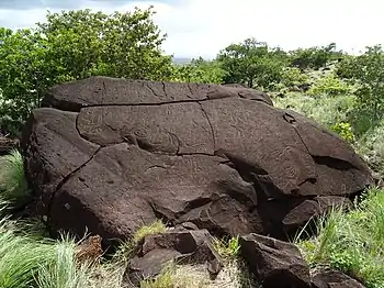 Las rocas decoradas tienen dimensiones variadas; una de las más grandes mide 5,20 m de largo por 4,30 m de ancho y 2,10 m de alto (fig. 2); sin embargo, la mayoría no sobrepasa los 2 m de largo, 1 m de ancho por un 1 m de alto. Estas rocas están diseminadas en el seno de un caos rocoso compuesto de rocas de origen volcánico.