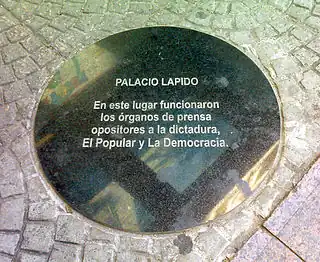 Una marca de la memoria en la vereda frente al Palacio Lapido recuerda el lugar donde se encontraba El Popular.[4]