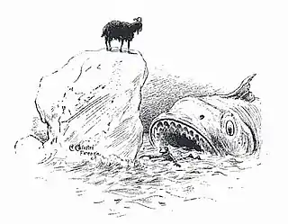 Pinocho lleva a Geppetto en su espalda y nada fuera de la boca del Tiburón, ilustración de una edición italiana de 1902.