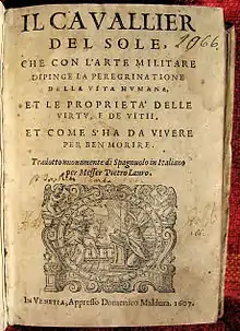 - — (1584). Il cauallier del sole : che con l'arte militare dipinge la peregrinatione della vita humana, et le proprietá delle virtu, e de vitii, et come s'ha da viuere per ben morire (en italiano). Venecia: Fabio & Agostin Zoppini, Fratelli. OCLC 433774411.