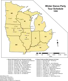 Buddy Holly terminó su asociación con "The Crickets" en noviembre de 1958. Para el comienzo de la gira "Winter Dance Party" consiguió una banda que estaba conformada por Waylon Jennings (bajo), Tommy Allsup (guitarra) y Carl Bunch (batería), con el vocalista principal Frankie Sardo. La gira cubriría 24 ciudades a través del centro de los Estados Unidos en el tiempo que fuera necesario. Las nuevas sensaciones Ritchie Valens, J.P. Richardson y Dion DiMucci, junto con su banda "The Belmonts", se unieron al tour para promover sus grabaciones y tener un ingreso extra.[1][2]