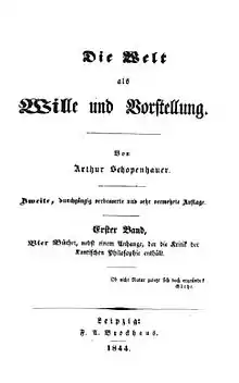 El mundo como voluntad y representación (Die Welt als Wille und Vorstellung, en el original alemán) es el título de la obra capital del filósofo alemán Arthur Schopenhauer.[1] Publicada por primera vez en 1819, por la editorial Brockhaus de Leipzig, es considerada la más elaborada manifestación del pesimismo filosófico y ha influido en multitud de pensadores y escritores, de la categoría de Freud, Nietzsche, Karl Popper, Cioran y Borges, entre otros. Schopenhauer parte principalmente del idealismo de Kant, y de otros filósofos como Platón, Hume y Berkeley, pero también es tributario, en gran medida, de las filosofías hinduista (las Upanishads) y budista. Su propósito último es la explicación cabal del mundo en todos los aspectos y bajo todos los puntos de vista, tarea que el filósofo aborda a través de los conceptos de voluntad y representación. Todo su trabajo posterior no supuso más que el desarrollo de las ideas fundamentales expuestas en esta obra.