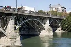 Respecto al lugar exacto que aparece representado en el mismo no cabe la menor duda de que se trata del famoso Puente de Isabel II, más conocido como «Puente de Triana» de Sevilla, donde el incipiente artista residió básicamente desde su ingreso voluntario en el Ejército del Aire el 29 de diciembre de 1939 hasta su traslado a Salamanca en febrero de 1943,[1] si bien el hecho de que el cuadro fuese realizado de memoria (algo extremadamente habitual en el conjunto de su amplia producción paisajística) hace que se aprecien entre este y la construcción real no pocas desemejanza.