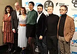 ![]() Parte del equipo artístico, de izquierda a derecha: Mariela Besuievsky (productora), Álex de Pablo (director de fotografía), Mercedes Gamero (productora), Isabel Peña (guionista), Rodrigo Sorogoyen (director y guionista), Olivier Arson (músico) y Alberto del Campo (montador). | ||