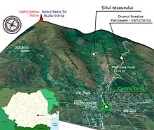 El pueblo de Pietroasa está situado a 20km al oeste de la ciudad de Buzău, 18km al este de la ciudad de Mizil, al pie de la colina Istrița.[22]La carretera nacional Ploiești - Buzău DN1B y el ferrocarril pasan por el sur del pueblo a una distancia de unos tres kilómetros. La estación CFR más cercana es la estación Ulmeni. Precisamente en esta región del pueblo de Pietroasa, las montañas de los Cárpatos orientales, orientadas de norte a sur, giran hacia el oeste y la llanura se extiende hasta debajo de la colina, a menudo llamada la montaña Istrita, cuyo pico más alto alcanza una altitud de 750 m. Las laderas del cerro descienden en suaves pendientes hacia la meseta hasta cerca del pueblo. [22]