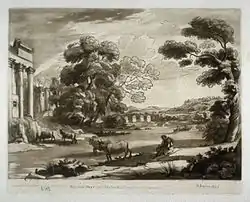 Claudio de Lorena fue un pintor francés establecido en Italia. Perteneciente al período del arte Barroco, se enmarca en la corriente denominada clasicismo, dentro del cual destacó en la pintura de paisaje. En su obra reflejó un nuevo concepto en la elaboración del paisaje basándose en referentes clásicos —el denominado «paisaje ideal»—, que evidencia una concepción ideal de la naturaleza y del propio mundo interior del artista. Esta forma de tratar el paisaje le otorga un carácter más elaborado e intelectual y se convierte en el principal objeto de la creación del artista, la plasmación de su concepción del mundo, el intérprete de su poesía, que es evocadora de un espacio ideal, perfecto.[1]