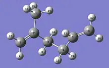 En algún punto del régimen de baja extensión, es decir, cuando todas las torceduras a lo largo de la cadena se extienden simultáneamente, se vuelve energéticamente más favorable tener una transición de torcedura a una conformación extendida para estirar más la cadena. La tensión aplicada puede obligar a una sola unidad de isopreno dentro de una torcedura a adoptar una conformación extendida, aumentando ligeramente la distancia de extremo a extremo de la cadena, y la energía requerida para hacer esto es menor que la necesaria para continuar extendiendo todas las torceduras simultáneamente. . Numerosos experimentos[13] sugieren fuertemente que el estiramiento de una red de caucho va acompañado de una disminución de la entropía. Como se muestra en la Fig. 2, una unidad de isopreno tiene tres enlaces C-C simples y hay dos o tres ángulos de rotación preferidos (orientaciones) sobre estos enlaces que tienen mínimos de energía. De las 18 conformaciones rotacionales permitidas, solo 6 tienen distancias de extremo a extremo extendidas y obligar a las unidades de isopreno en una cadena a residir en algún subconjunto de los estados extendidos debe reducir el número de conformaciones rotacionales disponibles para térmica. movimiento. Es esta reducción en el número de estados disponibles lo que hace que la entropía disminuya. A medida que la cadena continúa enderezándose, todas las unidades de isopreno en la cadena finalmente se fuerzan a adoptar conformaciones extendidas y se considera que la cadena está "tensa". Se puede estimar una constante de fuerza para la extensión de la cadena a partir del cambio resultante en energía libre asociado con este cambio de entropía.[6] Al igual que con el régimen Ia, el modelo de fuerza para este régimen es lineal y proporcional a la temperatura dividida por la tortuosidad de la cadena.