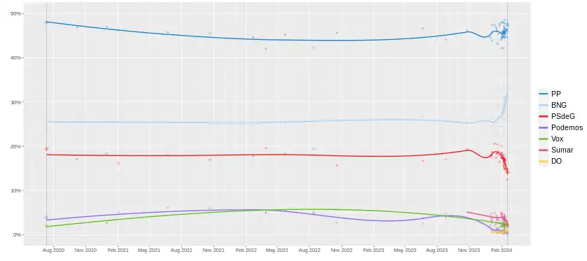 - «[A] GALICIA · Encuesta GESOP 11/02/2024: PP 44,5% (38/39) · BNG 31,0% (24/26) · PSdeG-PSOE 15,5% (11/12) · VOX 3,5% · SUMAR 2,5% · DO 0,7%». Electográfica | Encuestas y punto (antes Electograph). 11 de febrero de 2024. Consultado el 11 de febrero de 2024.