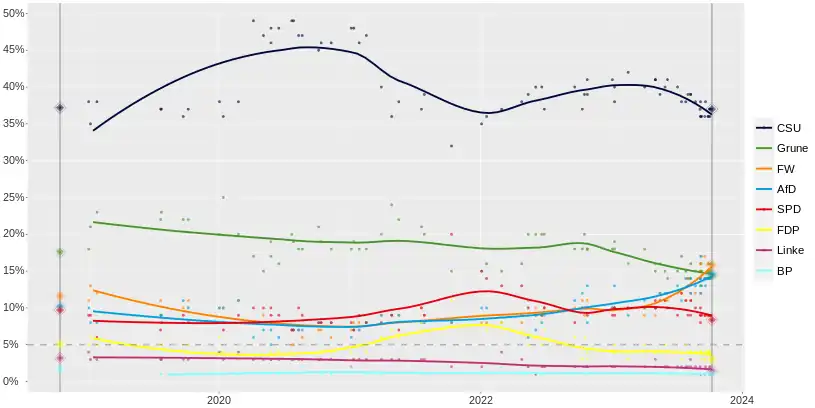 FW: 37 escaños CSU: 85 escaños AfD: 32 escaños | ||||||||||