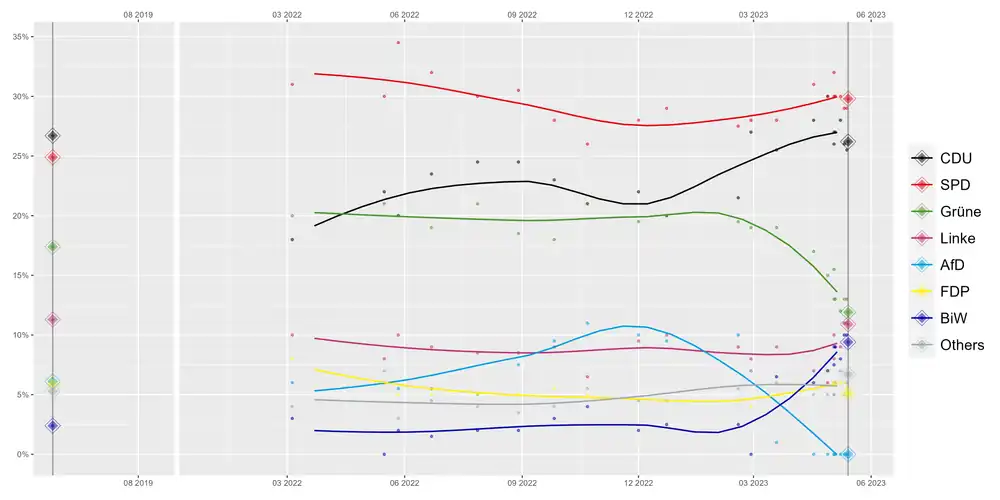 | Infratest dimap[19] | 04.05.2023 | 27 % | 30 % | 13 % | 10 % | — | 6 % | 9 % | 5 % |