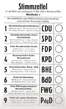 FWG = Freie Wählergemeinschaft Rheinland-Pfalz (Lista del DRP con algunos candidatos del Deutschen Partei).
