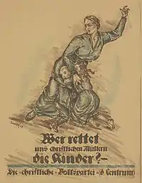Cartel del Zentrum. En alemán: "¿Quién salvará a nuestros hijos sino sus madres cristianas?".