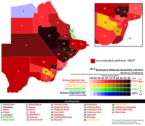 El legislativo se disolvió al término de su mandato constitucional, el 30 de agosto de 1974, y se convocó a elecciones para el 26 de octubre. Para entonces, y a pesar del sistema de partido hegemónico que encabezaba del BDP, Botsuana era el único país del sur de África que mantenía un régimen democrático. Tres de los cuatro estados que rodeaban al país: Sudáfrica, Namibia y Rodesia, se encontraban bajo regímenes racistas controlados por las minorías blancas. Mientras tanto, entre 1969 y 1973, Kenia gobernada por Jomo Kenyatta y Zambia gobernada por Kenneth Kaunda, las últimas dos naciones aparte de Botsuana donde todavía existían grupos de oposición legales, se habían convertido en estados de partido único.[8] En enero de 1970, Leabua Jonathan, primer ministro de Lesoto, perpetuó un autogolpe de estado para anular la victoria electoral de la oposición. Angola y Mozambique accederían a la independencia de Portugal al año siguiente con gobiernos socialistas de un solo partido. Los demás países de la región ya tenían gobiernos unipartidistas desde la primera mitad de la década de 1960.[2]