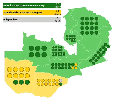 A pesar de la atmósfera tensa de la campaña y de la violencia preelectoral contra la oposición, la jornada electoral se desarrolló de manera pacífica y estudios posteriores consideran que el escrutinio fue en gran medida «limpio», a pesar del sistema electoral y las condiciones injustas, en especial comparándolo con otras elecciones africanas de la época.[31] El UNIP obtuvo una esperable victoria abrumadora con el 73,29% de los votos válidamente emitidos en las circunscripciones disputadas, a los que se sumarían los votantes registrados en las veintiocho circunscripciones que ganó sin oposición, garantizándole a Kaunda una mayoría superior al 80%. Hasta la fecha, se trata del porcentaje de voto popular más abultado logrado por un presidente zambiano en una elección multipartidista (aunque teniendo en cuenta solo los votos debidamente emitidos, sería superado por el 75,76% de Frederick Chiluba en 1991). Beneficiado por la práctica ausencia de una oposición organizada en sus principales bastiones, el UNIP arrasó en todas las circunscripciones al este del «cinturón de cobre» y ganó las regiones norteñas donde la elección se celebró casi unánimemente.[31] Su porcentaje más bajo en la zona oriental fue en la provincia natal de Kaunda, el Este, donde obtuvo el 94,97% (sería, curiosamente, la única provincia que ganaría en 1991).[32] También logró ganar por un margen aplastante en el Noroeste, con casi el 90% de los votos. Esta sería la única provincia occidental donde el UNIP volvería a ganar alguna circunscripción tras el retorno del multipartidismo.