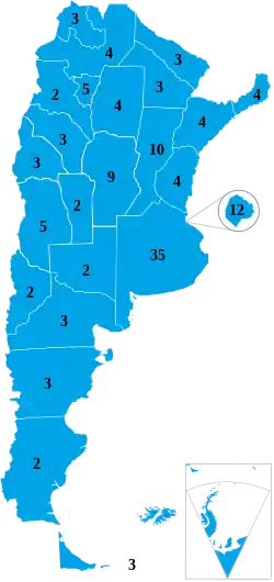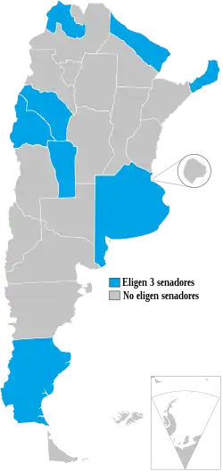 La Cámara de Senadores, según el art. 54 de la Constitución Nacional, se integra con tres diputados por cada distrito electoral (23 provincias y la CABA), de los cuales dos corresponden a la fuerza política con mayor número de votos y uno a la segunda. Los mandatos de los senadores duran seis años y son reelegibles indefinidamente.[11] Para ser senador se debe tener una edad mínima de 30 años.[12]