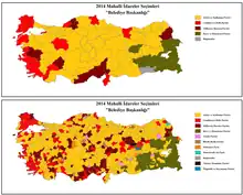 El 30 de marzo de 2014[nota 1] fueron celebradas en Turquía elecciones locales (oficialmente: Elecciones generales de la autoridad local, en turco: Mahalli İdareler Genel Seçimi o simplemente Yerel Seçimleri). Se eligió a los alcaldes metropolitanos y de distrito, así como los consejos municipales y provinciales. En zonas rurales fueron elegidos los muhtares y los "consejos de ancianos" (en las zonas urbanas también fueron elegidos los mahalles). Debido a la controversia que rodeó a las elecciones, estas fueron vistas como un referéndum a Recep Tayyip Erdoğan.[1] Alrededor de 50 millones de personas tuvieron derecho a voto.