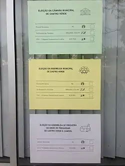 | Censo electoral | 9 411 442 | Censo electoral | 9 411 442 | Censo electoral | 9 411 442 | ![]() Municipios de Portugal, la circunscripción electoral. |