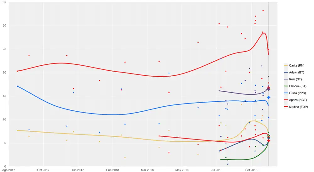 | Ipsos Perú/América[4][lower-alpha 1] | 7 oct 2018 | ? | 15.2 | 18.3 | 14.4 | – | 7.6 | – | – | 3.1 | |