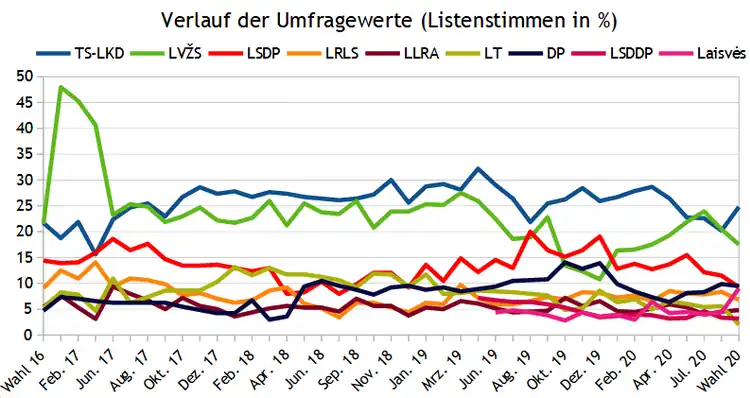 | Encuestadora | Fecha | TS-LKD | LVŽS | LSDP | LSDDP | TT | LRLS | LLRA | LCP | DP | Laisves |