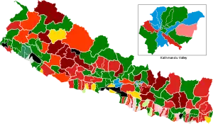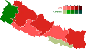 El CPN (UML) ganó 78 escaños en las elecciones y fue el segundo partido más grande en la Cámara de Representantes. Sin embargo, el partido obtuvo la mayor cantidad de votos en el sistema proporcional de listas de partidos.[49]