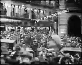 En lo que fue considerado una innovación absoluta, el Comité Nacional de la UCR encargó la filmación y exhibición gratuita de una película, que se denominó "La obra del gobierno radical, 1916-1922". La película, de casi cuarenta minutos, estuvo a cargo del cineasta italiano Federico Valle y retrataba una gran cantidad de logros alcanzados durante el primer mandato de Yrigoyen, (tales como el respeto a la clase obrera, reformas educativas y sanitarias, y el crecimiento económico) mientras unos subtítulos explicaban por qué los electores debían votar nuevamente al exmandatario. La película finalizaba con el mensaje: "¡Obrero o empleado! El gobierno radical hizo por ti, por tu bien, el de tu esposa, el de tus hijos, lo que ningún otro gobierno había hecho antes, o hará después, que no sea él. Hijo de tu fuerza, es tu fuerza la que habrá de engrandecerlo. Tu voto no puede serle traidor porque sería traicionar a ti mismo, a tu hogar y a tus hijos. ¡Votad por los candidatos de la Unión Cívica Radical!".[14] Se trató de la primera ocasión en la que un candidato político argentino recurría a la cinematografía para hacer campaña.[12][4]