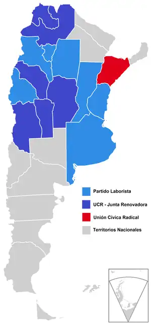 Con un amplio consenso histórico al respecto, la nota más destacada de la elección provincial fue la provincia de Corrientes, único distrito donde el peronismo no accedió a la gobernación.[40] La fragmentación en más de cinco fórmulas entre conservadores, radicales y peronistas provocó un Colegio Electoral en el que el PL y la UCR-JR no tenía mayoría, y los partidos conservadores tampoco. Con la UCR como único contrapeso y dada su intransigencia absoluta a votar una fórmula que no fuera la suya, los electores del Partido Demócrata Nacional (PDN) y del Pacto Autonomista - Liberal (PAL), que habían sido la unidad más votada, optaron por investir gobernador al radical Blas Benjamín de la Vega para evitar que el peronismo tomara el control de la provincia.[40] Tras su derrota, la dirigencia laborista-radical renovadora rechazó esta investidura por diversos medios, pero el Ministerio de Interior aceptó reconocer el resultado poco antes de la juramentación de De la Vega.[40]