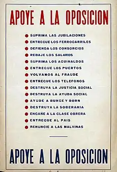 Nada más finalizado los comicios, la situación de tensión se reanudó y Perón ordenó el retorno del estado de guerra interno el 12 de noviembre.[38] El reelecto vicepresidente Juan Hortensio Quijano falleció en abril de 1952, antes de asumir su segundo mandato, por lo cual en 1954 se celebraron comicios para vicepresidente. Ya iniciado su segundo periodo presidencial, el gobierno peronista comenzó a tornarse cada vez más represivo, sobre todo después del fallecimiento de Eva Perón tan solo un mes más tarde, y los ataques contra la oposición se intensificaron. A partir de 1954, Perón pasó de buscar una alianza con la Iglesia católica (como en su primer mandato) a atacarla sistemáticamente, contribuyendo a la creciente oposición de sectores organizados de la sociedad en su contra, conduciendo a su caída en 1955.[52]