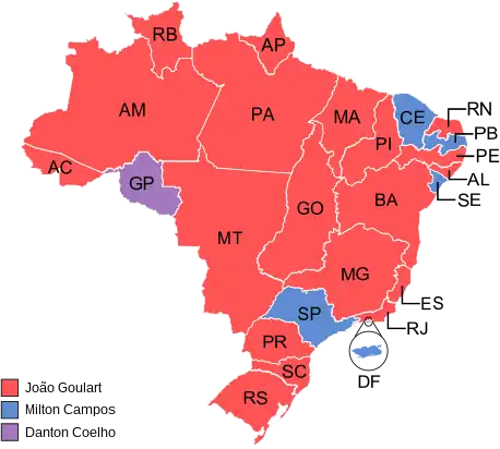 | Estado/Território | João Goulart | Milton Campos | Danton Coelho | Válidos | Blancos | Nulos | Emitidos |