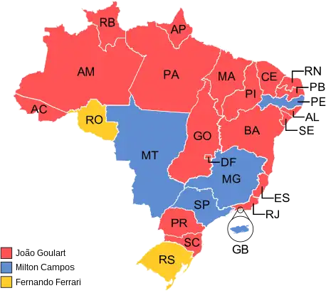 | Estado/Territorio | João Goulart | Milton Campos | Fernando Ferrari | Válidos | Blancos | Nulos | Emitidos |