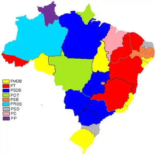 | Río de Janeiro | RJ | Luiz Fernando Pezão | PMDB | Francisco Dornelles | El Río en 1º Lugar PMDB/PP/PSDB/DEM/PSD/PPS/PSC/PSL/PMN/PSDC/PTC/SD/PTN/PRP/PRTB/PEN/PTB/PHS | |