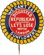 El Partido Republicano había buscado moderarse para evitar mostrarse demasiado crítico con políticas que eran sumamente populares para el público estadounidense, y su plataforma electoral rescataba gran parte de la política de Roosevelt.[18][19] Landon respetaba y admiraba al presidente y aceptaba la mayor parte del New Deal, pero objetaba que era hostil a los negocios e implicaba demasiado desperdicio e ineficiencia. Evitando el tema económico, Landon y su equipo buscaron sostener la idea de que Roosevelt estaba intentando concentrar poderes en su persona y convertir al país en una dictadura. Al final de la campaña, Landon acusó a Roosevelt de estar «corrompido», es decir, de adquirir tanto poder que estaba subvirtiendo la Constitución: