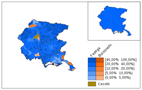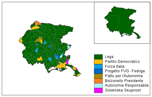 La elección contó con una amplia victoria del candidato del centroderecha Massimiliano Fedriga, con más del 57% de los votos y una gran actuación de la Liga, seguido del vicepresidente del consejo saliente y candidato del centroizquierda Sergio Bolzonello, que llegó segundo con casi el 27% de los votos, y el del Movimiento 5 Estrellas, que obtuvo menos del 12% de los votos.[2][3] La presidenta saliente de Friuli-Venecia Julia, Debora Serracchiani, había anunciado su voluntad de no volver a postularse.[4]