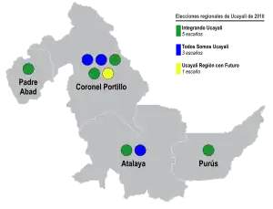 | Elecciones regionales de Ucayali de 2010 | 3 oct 2010 | — | 28.2 | 27.5 | 11.4 | 8.1 | 2.9 | 19.1 | – | 0.7 | |||