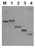 - Ream JA, Lewis LK, Lewis KA (October 2016). «Rapid agarose gel electrophoretic mobility shift assay for quantitating protein: RNA interactions». Analytical Biochemistry 511: 36-41. PMC 5002362. PMID 27495142. doi:10.1016/j.ab.2016.07.027.