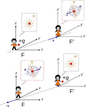 El marco de referencia elegido determina si un fenómeno electromagnético se considera un efecto eléctrico o magnético, o una combinación de ambos. Los autores suelen deducir el magnetismo de la electrostática cuando se tienen en cuenta la relatividad especial y la invariancia de carga. En Las Conferencias Feynman sobre Física (vol. 2, cap. 13-6) se utiliza este método para obtener la expresión de la fuerza magnética sobre una carga en movimiento paralelo junto a un cable que transporta corriente. Véase también Haskell[8] y Landau.[9]