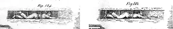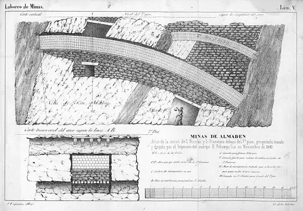 En la lámina aparece el problema, la aproximación de los filones conocidos como San Nicolás, a la izquierda, y San Francisco, a la derecha, y la solución adoptada, un arco, de mampostería de 22,5 varas de cuerda, sobre una cimbria provisional de mampostería en seco que luego se retiraría. Según indica Ezquerra del Bayo, en ninguna mina del mundo se había construido hasta ese momento un arco de sostén tan grande.