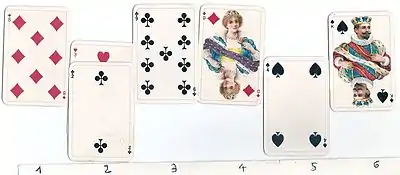 - A una carta de picas debe seguir un corazón, a una de corazón un diamante, a un diamante un trébol y a un trébol una pica.