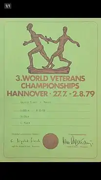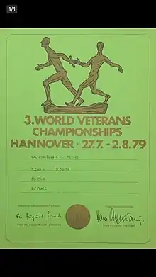 Master Nivel Mundial Entreno para participar en el Campeonato Mundial Master que se efectuó en Hannover, Alemania el 1 de agosto de 1979, en la prueba de 3000 metros planos con obstáculos (Steeplechase) y 5000 metros planos en ambas obteniendo el 1°Lugar. en la carrera de 3000 metros con obstáculos (Steeplechase) ostenta el Récord Mundial en su categoría.