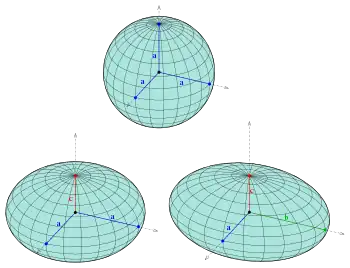 donde a, b y c son las longitudes de los semiejes del elipsoide respecto de los ejes x, y, z, respectivamente; son números reales positivos y determinan la forma del elipsoide. Si dos de estos semiejes son iguales, el elipsoide es un esferoide; si los tres son iguales, se trata de una esfera.