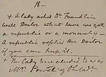 - Algunas fuentes citan la respuesta de Franklin como «A republic, madam ...» («Una república, señora ...»)[2] cuando James McHenry volvió a contar la historia en el periódico The Republican, or Anti-Democrat el 15 de julio de 1803.[3] La entrada del diario original de McHenry durante la Convención dice: «A lady asked Dr. Franklin well Doctor what have we got a republic or a monarchy – A republic replied the Doctor if you can keep it». («Una señora le preguntó al Dr. Franklin: Bien Doctor, ¿qué tenemos, una república o una monarquía? Una república, respondió el Doctor, si pueden conservarla»).[4][5]