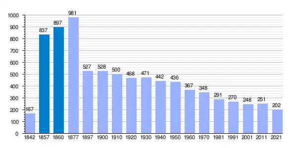 Población de derecho según los censos de población del INE. Población de hecho según los censos de población del INE.Entre el Censo de 1877 y el anterior, varía el término del municipio porque recibe a 25092 (Floresta) de 25138 (Mongay) y transfiere 255079 |