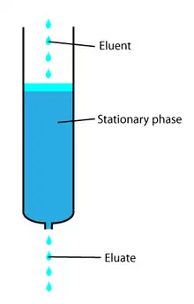 En un experimento de cromatografía líquida, por ejemplo, un analito generalmente se adsorbe, o se "une a", un adsorbente en una columna de cromatografía líquida. El adsorbente, una fase sólida (fase estacionaria), es un polvo que se recubre sobre un soporte sólido. Según la composición de un adsorbente, puede tener distintas afinidades para "retener" otras moléculas, formando una película delgada en la superficie de sus partículas. Entonces, la elución es el proceso de eliminar los analitos del adsorbente haciendo pasar un disolvente, llamado "eluyente", más allá del complejo adsorbente/analito. A medida que las moléculas de disolvente "eluyen", o viajan hacia abajo a través de la columna de cromatografía, pueden pasar por el complejo adsorbente/analito o pueden desplazar el analito uniéndose al adsorbente en su lugar. Una vez que las moléculas de disolvente desplazan el analito, el analito se puede sacar de la columna para su análisis. Esta es la razón por la que cuando la fase móvil sale de la columna, normalmente fluye hacia un detector o se recolecta para el análisis de composición.