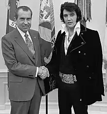 Dos de los principales asesores de Nixon, Dwight Chapin y Egil Krogh, prepararon una reunión para ambos en la Casa Blanca. En un primer momento, Nixon está muy irritado porque ve que Elvis solo buscaba darse publicidad, pero en el transcurso de la reunión van descubriendo que tienen mucho en común: los dos son hombres que han llegado a su posición por sus propios méritos y han trabajado duro para triunfar, le regala un arma clásica en una caja y los dos se sienten despreciados por esa nueva cultura americana que ya no entienden. La reunión culminó con una icónica foto de ambos dándose la mano.