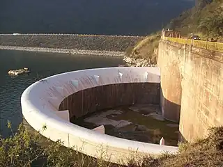 La presa es de material suelto —un núcleo de arcilla y revestimiento de rocas— de planta curva y con presas laterales. La presa principal tiene 72 m de ancho de coronación, con tres presas laterales 385 m adicionales. El vertedero, ubicado aguas arriba sobre su margen derecha, tiene forma de embudo con perfil Creager, sin compuertas, formado por un muro circular de 22 m de alto, que descarga a través de un túnel de 377 m de largo.[5] Contiene también una toma para agua potable en el cuenco disipador y un vertedero auxiliar de emergencia con canal evacuador. El descargador de fondo dispone de compuertas y válvulas disipadoras en sus extremos. En total, se excavaron 2 800 000 m³ de roca y tierra,[5] y se utilizaron 4 735 000 m³ de materiales en su construcción.[2] Posee una galería interna de inspección de filtraciones.[5]