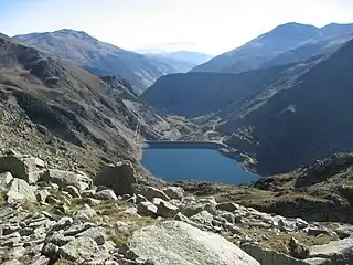 La presa recoge las aguas procedentes de todos los lagos que hay en dos circos glaciares separados por una carena, el Tossal Tancat, y que están uno junto al otro, orientados de norte a sur.