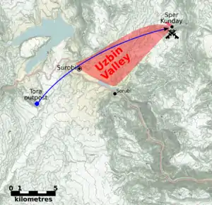 ![]() Puesto avanzado de Tora, pueblo de Surobi, valle de Uzbin y pueblo de Sper Kunday en el mapa. | ||||